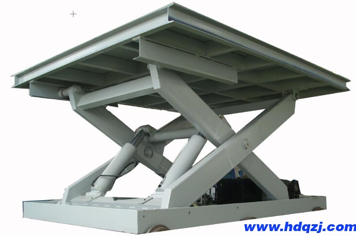 平臺部分:是承載重物的鋼結構平臺,有封閉式或敞開式,兩側裝有導向滾輪或導靴,平臺底部可聯(lián)接升降油缸或聯(lián)接升降剪叉形鋼架。